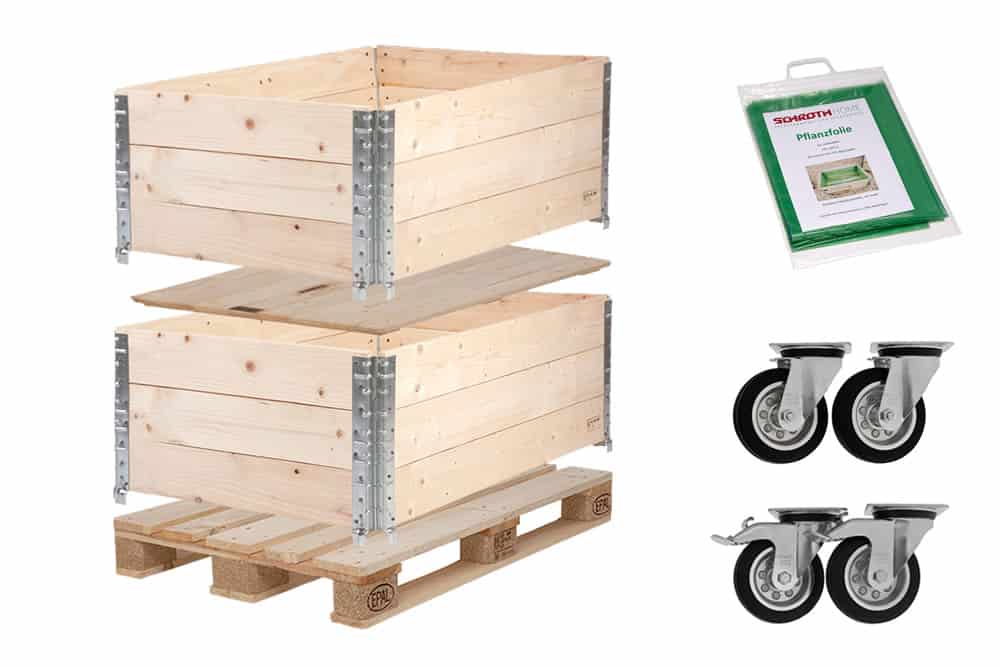 Das grosse Hochbeet Set „Mobil“ (Faltrahmen) ist für den mobilen Einsatz auf der Terrase oder dem Balkon ausgelegt. Die Hochbeet Faltrahmen in der Grösse 800x1200x400 mm (BxLxH) werden auf einer EPAL Europalette mit vier Schwerlastrollen montiert. Ergänzt wird das Set mit einem Zwischenboden / Hochbeetdeckel und einer Pflanzfolie, welche innen im Hochbeet Rahmen befestigt wird.