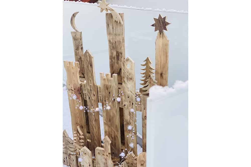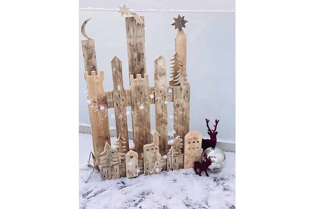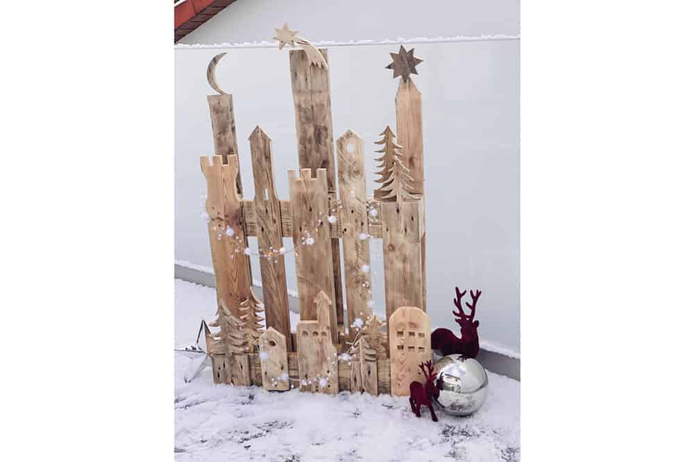 Gegen Witterungseinflüsse und für eine längere Lebensdauer empfehlen wir Ihnen die winterliche Paletten Landschaft mit einer Holzimprägnierung zu versehen.
